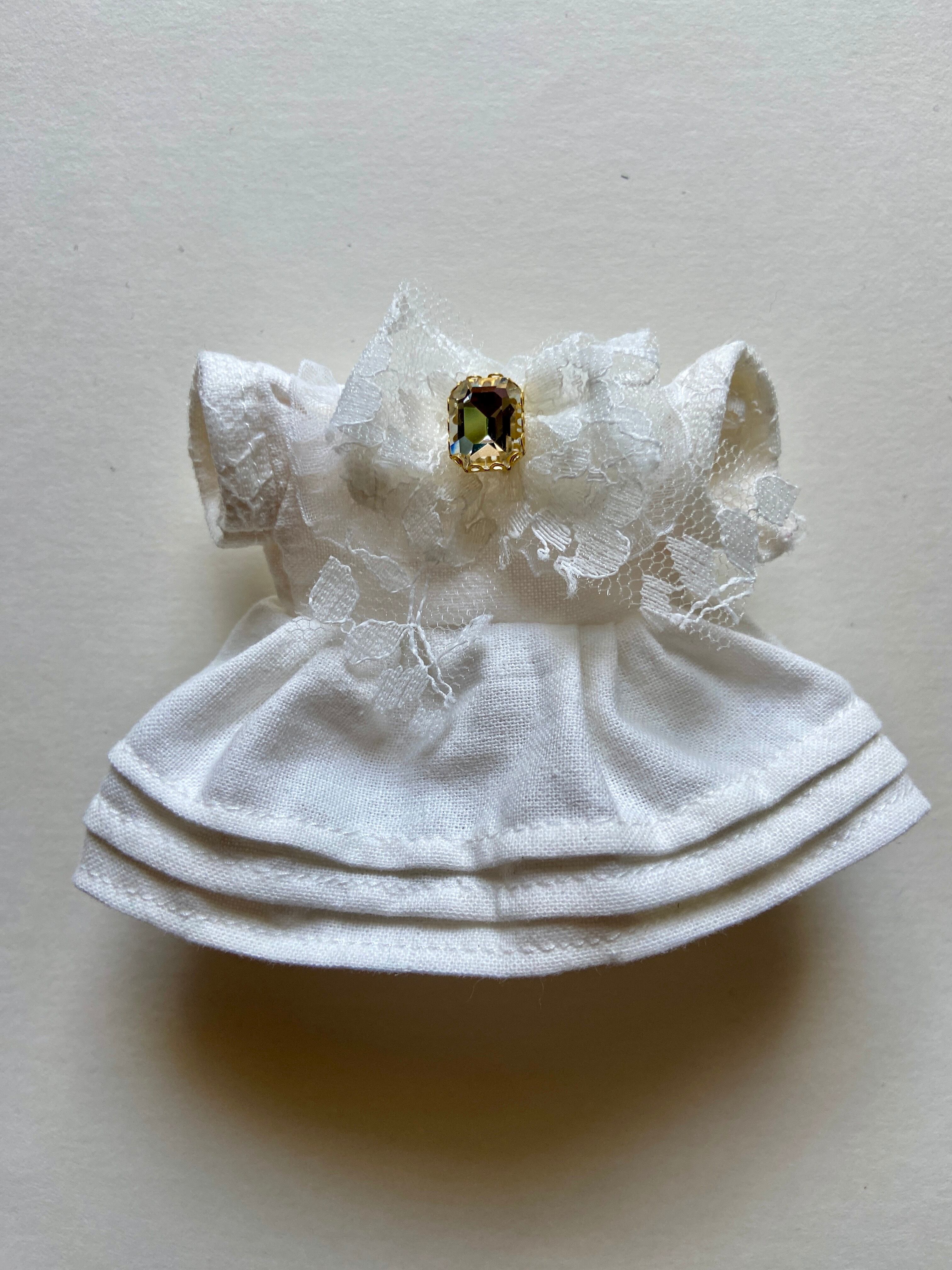 繊細なレースの襟元を囲むようにフリルをあしらい、細部まで丁寧に装飾を施しました。